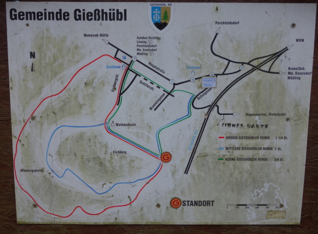 Sie starten ihre Wanderung auf dem Friedhofs Parkplatz Hinterbrühl (307 Höhenmeter). Gehen Sie die Eichbergstraße weiter bergauf, oberhalb des Friedhofes gehen Sie links und kommen bald auf eine Schotterstraße. Es geht bergauf. Fast an der Kuppe angelangt kommen Sie wieder auf eine Straße dieser folgen Sie bis Sie auf der rechten Seite eine kleine Wiese mit einem Tisch und Bank unter einem Baum entdecken. Dort sehen Sie, einen kleinen Weg links oberhalb der Häuser vorbeigehen. Diesen nehmen Sie - wenn Sie nicht mit Kinderwagen unterwegs sind, und keine Angst vor einer großen Dogge haben, die spielerisch gegen den Zaun springt. Sie kommen auf eine große Schotterstraße und wenden sich rechts.