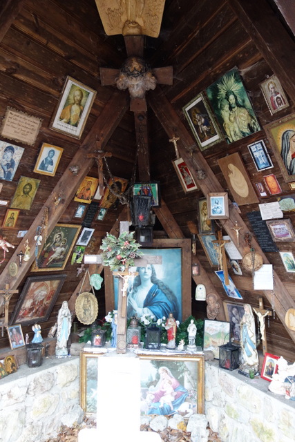 Gleich unterqueren Sie in einem Tunnel die Autobahn. Sie folgen dem Weg bergauf und halten sich an der nächsten Kreuzung links. Vorbei am Schlagbaum immer bergauf. Bald treffen Sie in einem T auf eine Kreuzung. Sie halten sich rechts und folgen dem breiten Weg immer geradeaus. Sie passieren ein Schild mit Wanderwegen und halten sich geradeaus. Bald darauf treffen Sie auf ein weiteres Schild mit Wanderwegen und gehen links in einer langgezogenen Serpentine bergauf. Sie folgen dem Weg, bis Sie rechts einen Schlagbaum sehen. Gleich dahinter auf der rechten Seite ist die Waldandacht (588 Höhenmeter). Ein skurriler Ort, den Sie nach ca. 1 Stunde Wanderung erreicht haben.